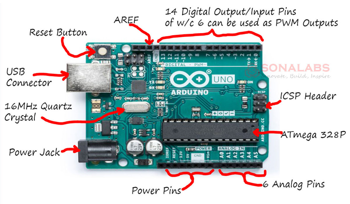 The Arduino Uno is a microcontroller board based on the ATmega328P. The Uno board has 14 digital input/output pins (6 of which can be used as PWM outputs), a USB connector, an ICSP header, a 16MHz quartz crystal, a power jack, and a reset button. The board contains everything needed to support the microcontroller, all is required is to connect it to a computer via a USB cable or power it with an AC-to-DC adapter or battery to get started.