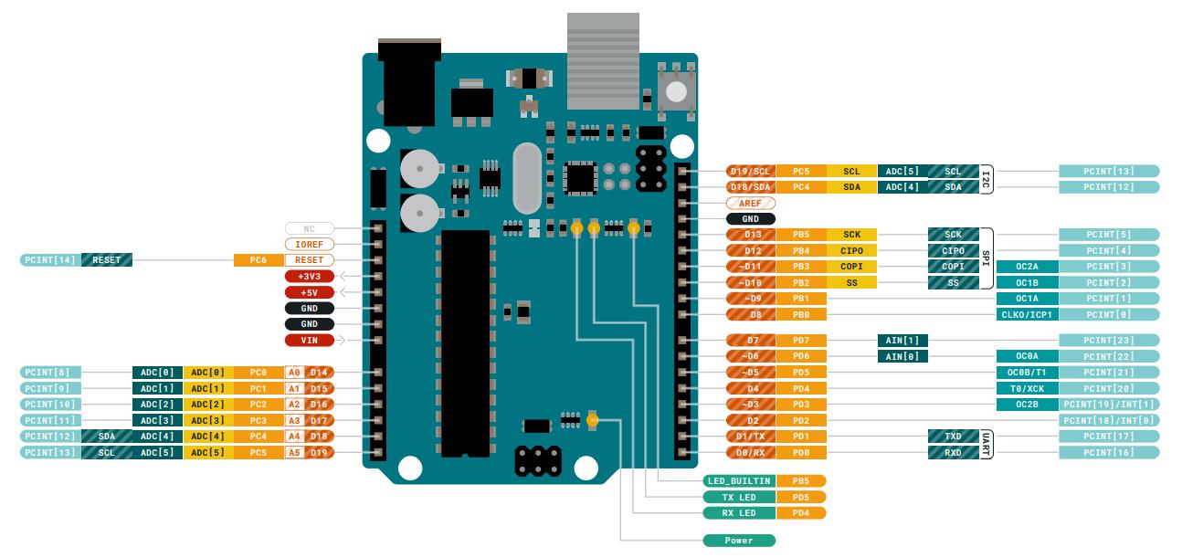 Download the full pinout diagram as a PDF here… Arduino Uno Rev3 Pinout.