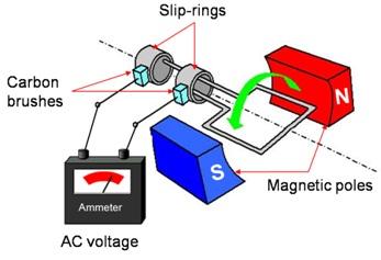 Consider a simple alternator with a rotating magnetic core (rotor) and a stationery wire (stator) with current induced in the stator by the rotating magnetic field of the rotor as shown in the figure below: