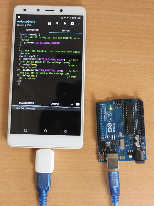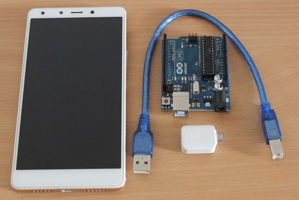 With the help of a USB OTG, connect the Arduino board to your smart phone using a USB cable.
