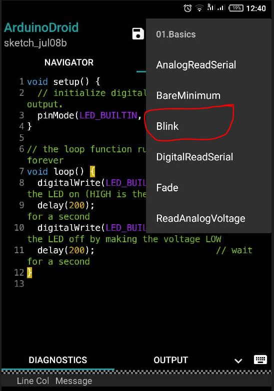 Open the app (arduinodroid.apk), head to the Menu (…) / Sketch/ Examples/ 01. Basics/ Blink to get the sample Blink.ino code into the IDE’s editor as shown in the figure below. Alternatively, you could create a new sketch and write your code that you can edit, save and upload onto the Arduino Board.