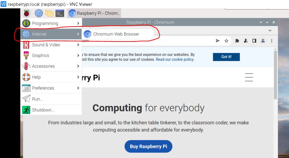 To access the Chromium web browser, click on the Raspberry Pi Icon to drop down a menu and then click on the Internet category and finally select Chromium web browser upon which on launching it will load the raspberrypi.com website.