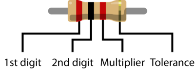 For a FOUR color band resistor, the first two bands indicate the two most significant digits of the resistor’s value. The third band is a weight value which multiplies the two significant digits by a power of ten. The final band indicates the tolerance of the resistor.