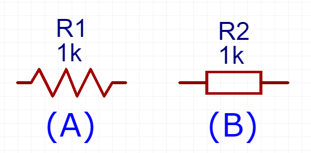All resistors have only two terminals, one on each end of the resistor and it’s these terminals that connect to the rest of the circuit. When simulating circuit schematics, resistors are often represented by one of these two schematic symbols.