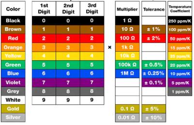 Alternatively, if you remember colors of the rainbow ie (ROYGBIV), simply remove “I” for Indigo then add Black and Brown to the front and Gray plus White at the end of the classical rainbow color-order. This gives us (BBROYGBVGW), the color codes for the Resistor.