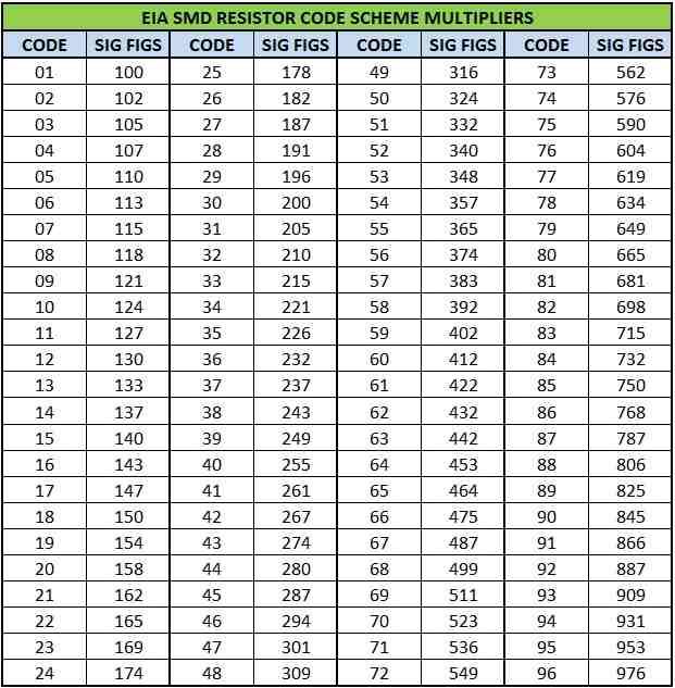 For this system, the markings exists out of three characters i.e two numbers and one letter eg “01A”. The two numbers in this case represent a code that indicates the resistance value with three significant digits and the letter is the multiplying factor that gives the final value of the resistor. For us to be able to decode this marking system, we shall use a tables below that show the values for each code which are basically the values from the E96 series. For-example the code 05 means 110Ω, code 33 means 215Ω as seen below: