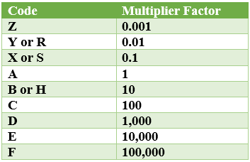 For this system, the first two or three digits indicate the numerical resistance value of the resistor and the last digit indicates the multiplier i.e the power of ten by which to multiply the given resistor value.