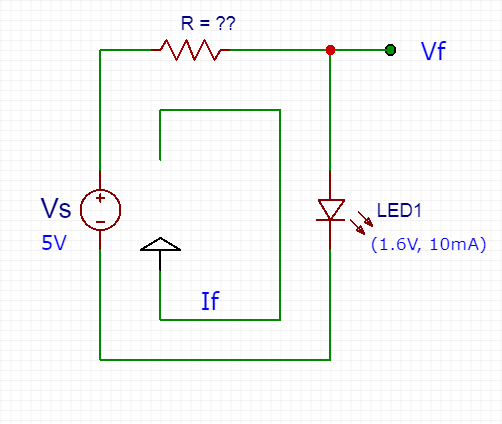 For-example in the circuit below, we have a 5V battery to power a red LED with a forward voltage of about 1.6V and a maximum forward current of 10mA. What is the value of the current-limiting resistor required?
