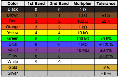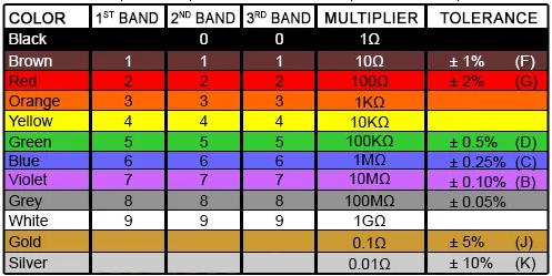 When decoding the resistor color bands we use a resistor color code table which shows each of the colors and which value, multiplier, or tolerance they represent.