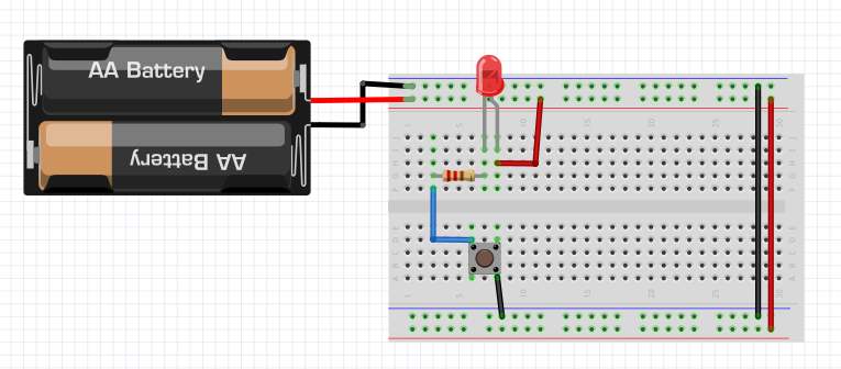In the Circuit above, we have a wire connecting the Vcc power rail to the positive (anode) leg of the LED, the negative (cathode) leg of the LED is connected to the 330Ω resistor, the resistor is then connected to a push-button. When the push button is pushed, it connects the circuit to ground completing the circuit and turning on the LED.