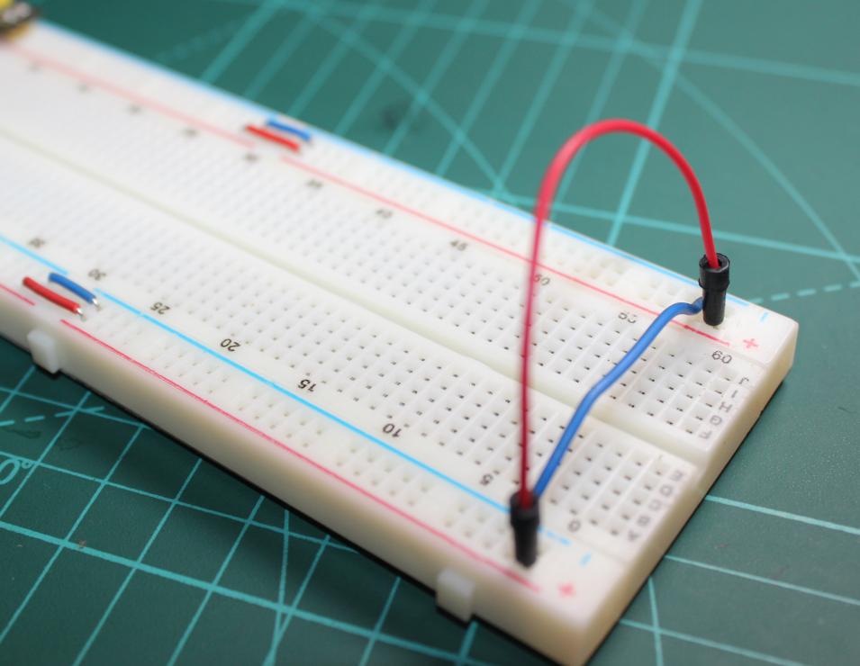 It should be noted however, that the two power rails on either side are not connected to each other and if you need the same power source on both sides, you’ll need to connect the two sides with jumper wires as shown below;