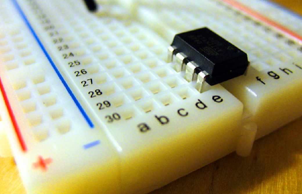 The ravine/valley that separates the two sides of the breadboard was specifically incorporated into breadboards to serve a very important purpose of connecting large components such as Integrated Circuits (ICs). These usually come in what is known as a Dual in-line Package (DIP) design – (a design where the legs come out of both sides of the component to fit perfectly over the valley) in order to minimize the amount of space they take up on the breadboard as shown below.